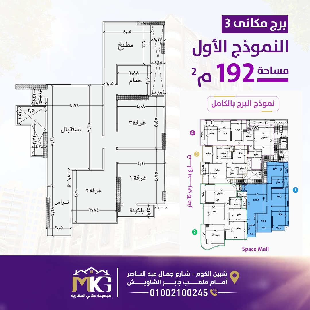 شقة 192م ببرج مكانى 3 امام سبيس مول