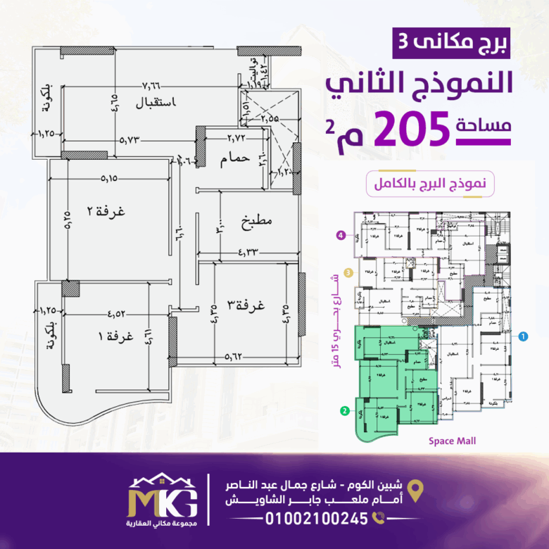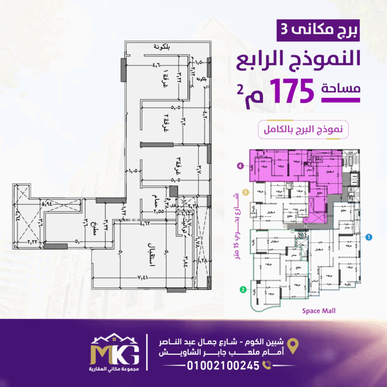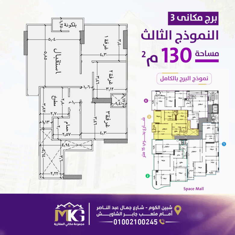 شقة 130م ببرج مكاني 3 امام سبيس مول